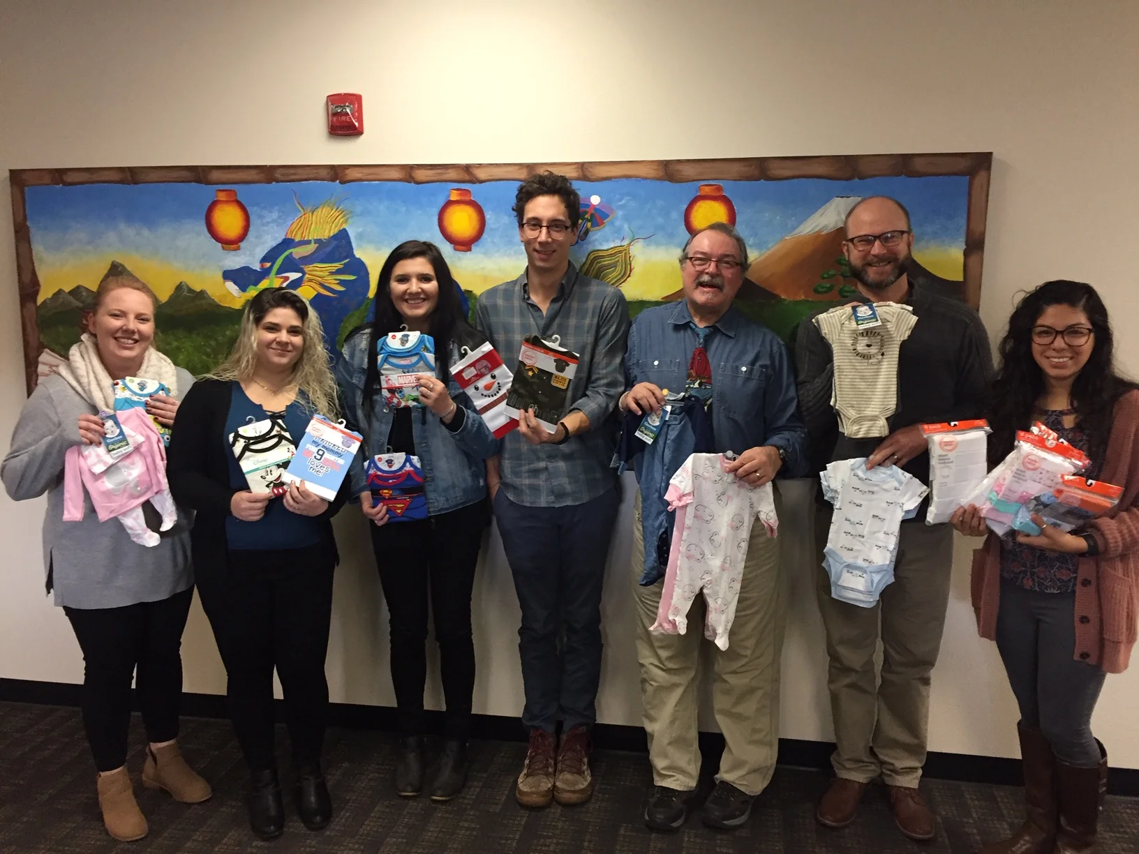 Riverfront School and Career Center staff show off a handful of the newborn baby clothes purchased with funding support from OCCU.