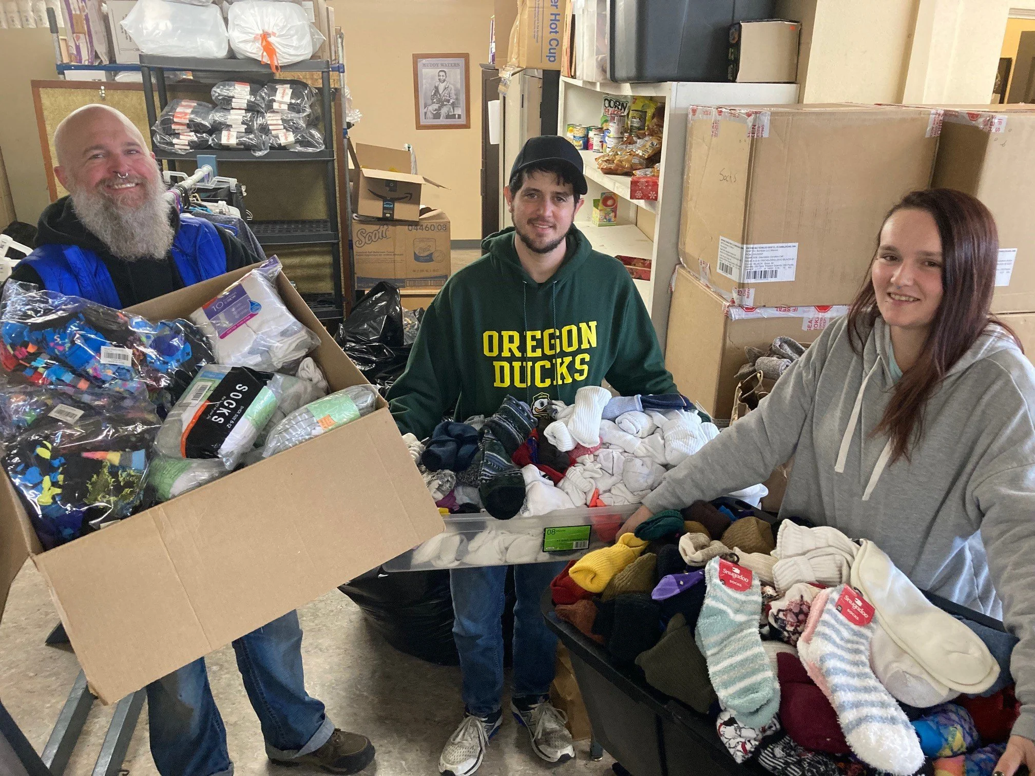 New Roads staff showing off sock donations from 2024 Socktoberfest drive.