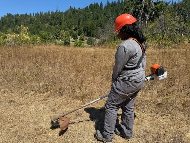 On a hot day in August, Amia, a 17-year-old soon-to-be Senior at Willamette High School, gears up with helmet, eye goggles and gloves and applies her string trimmer to the tall grasses in fields near Dorena Lake reservoir. Amia never handled tools such as these prior to her summer work experience with the Looking Glass Lane-Metro Youth Corps. Amina shared that she has learned so much from this experience and is using the money she has earned to save for car insurance.